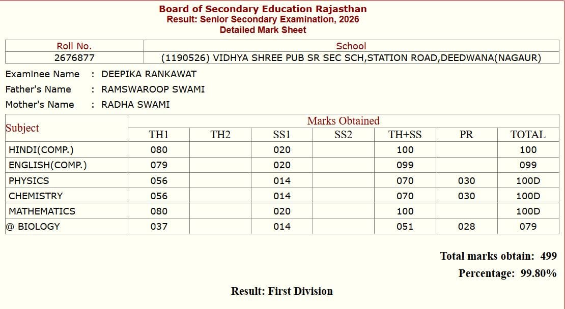 Rajasthan Board 12th Topper 2026: 500 में से 499 मार्क्स, देखें राजस्थान बोर्ड टॉपर दीपिका की मार्कशीट