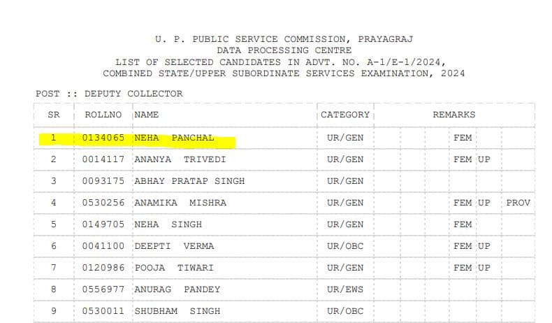 Neha Panchal Success Story: उत्तर प्रदेश स्टेट सिविल सर्विस परीक्षा 2024 का फाइनल रिजल्ट (UP PCS 2024 Final Result) जारी हो गया है. इसमें दिल्ली की रहने वाली नेहा पांचाल ने Rank 1 हासिल किया है. नेहा का सेलेक्शन डिप्टी कलेक्टर पोस्ट के लिए हुआ है.