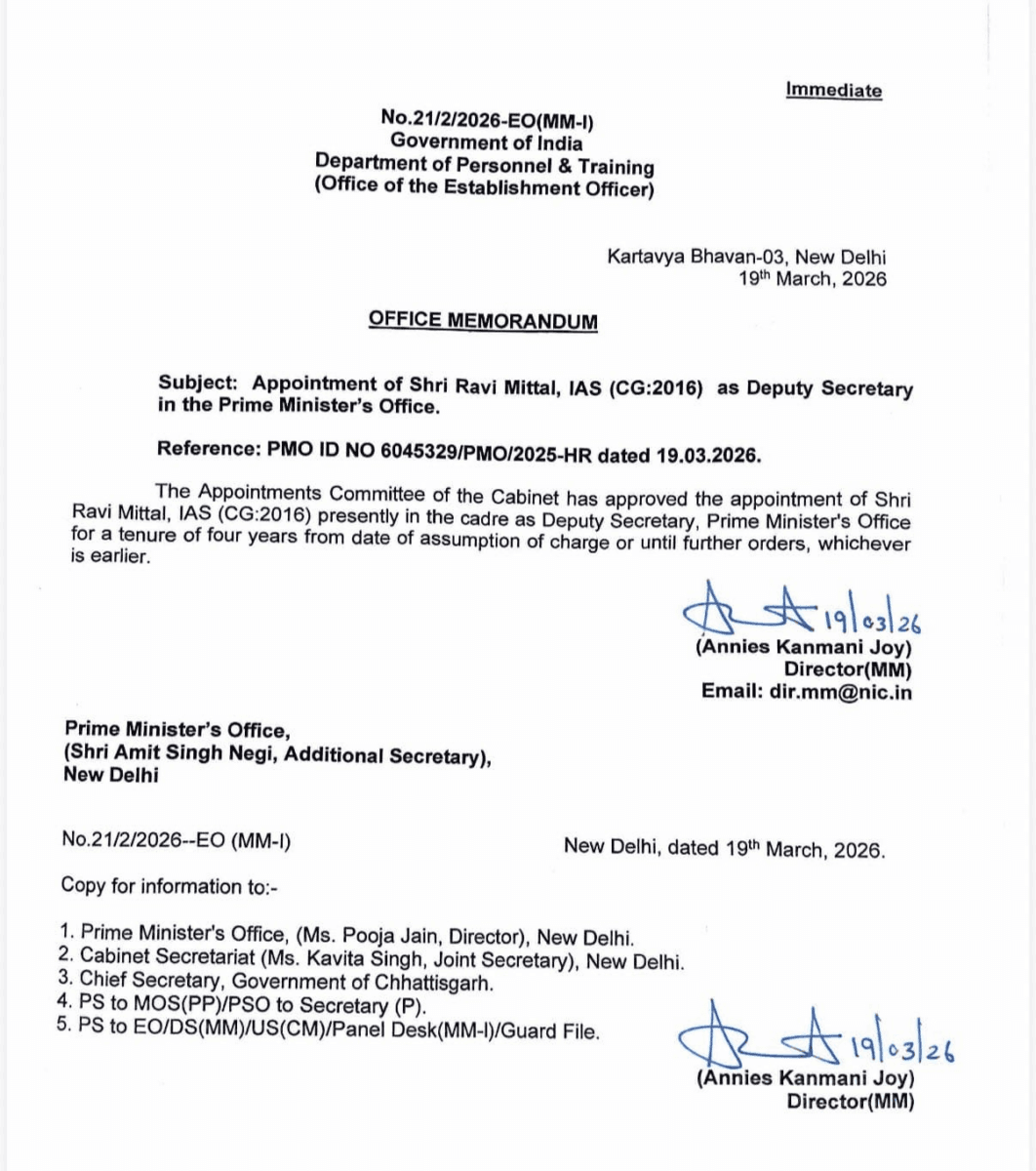 केंद्र सरकार ने अब रवि मित्तल को प्रधानमंत्री कार्यालय में डिप्टी सेक्रेटरी की जिम्मेदारी दी है. PMO में काम करना किसी भी अफसर के करियर का बड़ा पड़ाव माना जाता है. PMO में आने से पहले रवि मित्तल छत्तीसगढ़ में जनसंपर्क विभाग के कमिश्नर थे और साथ ही संवाद के CEO की जिम्मेदारी भी संभाल रहे थे.