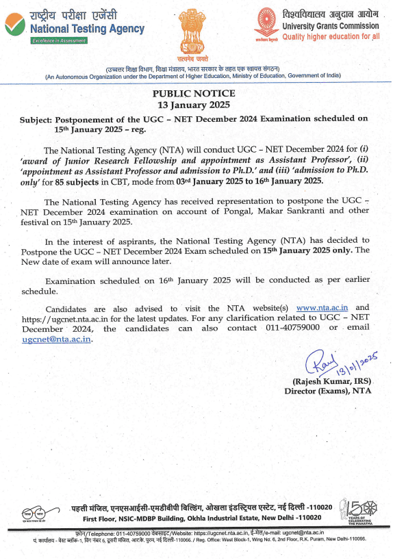 UGC-NET Exam: राष्ट्रीय परीक्षण एजेंसी (NTA) ने बताया, “15 जनवरी 2025 को होने वाली UGC-NET दिसंबर 2024 परीक्षा को स्थगित कर दिया है. 15 जनवरी 2025 को पोंगल, मकर संक्रांति और अन्य त्यौहारों के कारण UGC NET दिसंबर 2024 परीक्षा को स्थगित करने की मांग के बाद यह निर्णय लिया गया है. परीक्षा की नई तिथि बाद में घोषित की जाएगी. 16 जनवरी 2025 को होने वाली परीक्षा पहले से तय कार्यक्रम के अनुसार ही आयोजित की जाएगी.”