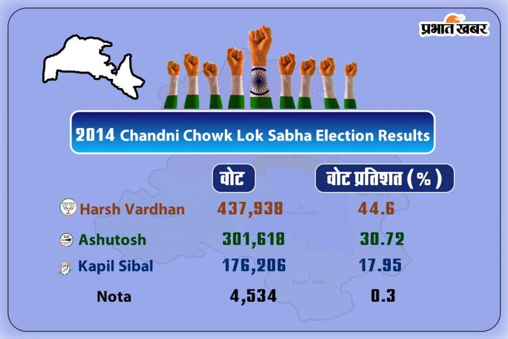 2014 में इस सीट पर बीजेपी से हर्ष वर्धन जीते थे. वहीं आप से आशुतोष फर्स्ट रनरअप रहे थे. हर्ष वर्धन को 4.3 लाख वोट मिला था. जबकि आशुतोष को 3 लाख वोट मिले थे. वोट प्रतिशत में बात करें तो हर्ष वर्धन को 44 फीसद जबकि आशुतोष को 30 प्रतिशत वोट मिले थे. वहीं कांग्रेस के कपिल सिब्बल को 17.95 प्रतिशत यानि 1.7 लाख वोट मिले थे.