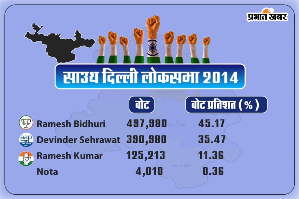 2014 के चुनाव की बात करें तो यहां रमेश बिधूड़ी जीते थे. बीजेपी ने उन्हें टिकट दिया था. बिधूड़ी को जनता से पसंद किया और उन्हें 4.9 लाख वोट मिले थे. वोट प्रतिशत की बात करें तो यह 45 था. वहीं आप के उम्मीदवार देविंदर सहरावत को 3.9 लाख वोट मिले थे. वोट प्रतिशत में यह आंकड़ा 35 फीसद था. वहीं कांग्रेस ने रमेश कुमार को लड़ाया था, जिन्हें सवा लाख वोट मिले थे.