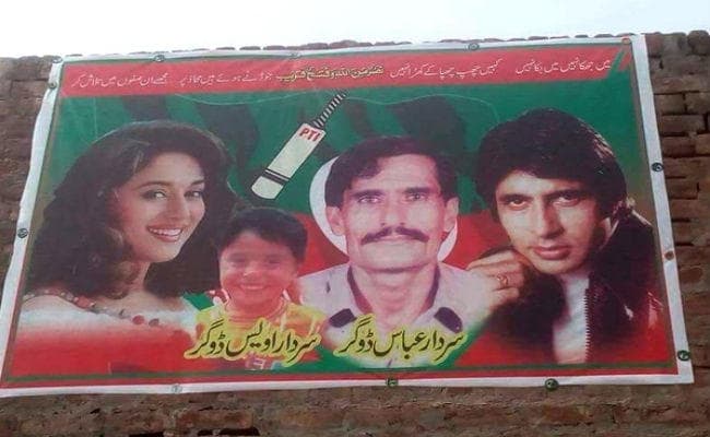 खास बात यहहै कि इस पोस्टर पर अमिताभ और माधुरी कीजो तस्वीरें लगायी गयी हैं, वे लगभग 30 साल पुरानी हैं. पीटीआई के इस उम्मीदवार ने पार्टी के चुनाव चिह्न बैट के साथ एक बच्चे की फोटो को भी पोस्टर में जगह दी है.