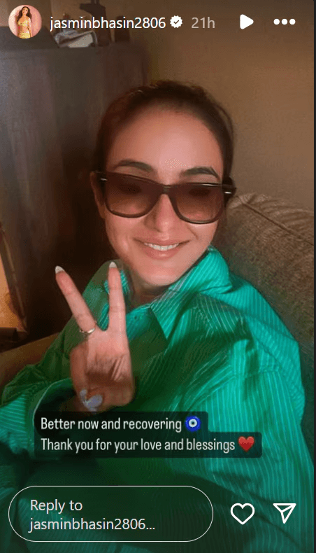 जैस्मीन भसीन ने बीते रविवार की रात को सोशल मीडिया पर अपनी फोटो शेयर करते हुए हेल्थ अपडेट दिया है. उन्होंने अपने ऑफिशियल इंस्टाग्राम पर एक सेल्फी अपलोड की और बताया कि वे अब पहले से ज्यादा अच्छी महसूस कर रही हैं और अच्छे स्वास्थ्य की ओर बढ़ रही हैं. उन्होंने अपने फैंस के प्यार और समर्थन के लिए धन्यवाद भी दिया. तस्वीर में दिखता है कि उनकी आंखों से पट्टी उतर चुकी है और वह चश्मा पहनी हुई हैं.