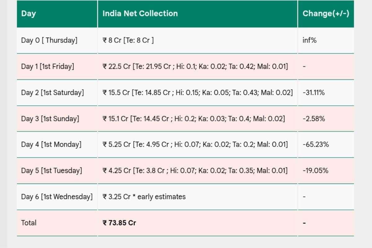Sacnilk की रिपोर्ट्स के अनुसार, फिल्म ने अपने छठे दिन यानी बुधवार को करीब 3.25 करोड़ रुपये की कमाई की. इसके साथ ही भारत में फिल्म का कुल कलेक्शन 73.85 करोड़ रुपये तक पहुंच गया है. पहले पांच दिनों में ही फिल्म 70 करोड़ का आंकड़ा पार कर चुकी थी.