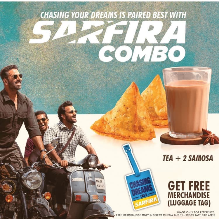 akshay kumar की फ़िल्म सरफिरा ने बीते शुक्रवार की सिनेमाघरों में दस्तक दिया था .इस फ़िल्म की पहले दिन का कलेक्शन 2.50 करोड़ था और दूसरे दिन इसमें इजाफा देखने की मिला .दूसरे दिन का कलेक्शन 4.25 तक पहुंच गया था और रविवार को फिल्म का कलेक्शन 5.10 करोड़ के आसपास ही पहुंच पाया था .जिसके बाद बीते दिन से ही प्रसिद्ध थिएटर चेन पीवीआर ने ज्यादा से ज्यादा दर्शकों को थिएटर तक लाने के लिए एक ऑफर फिल्म की टिकट के साथ जोड़ दिया. दरअसल फिल्म की हर टिकट के साथ एक चाय और दो समोसे देशों को मुफ्त में मिलेंगे. यह ऑफर यही खत्म नहीं हुआ है बल्कि इस फिल्म का मर्चेँडाइस टैग भी टिकट के साथ मुफ्त में दिया जायेगा. यह ऑफर्स फिल्म को कितना फायदा पहुंचाएगा यह तो आनेवाले दिनों में ही मालूम पड़ेगा.
