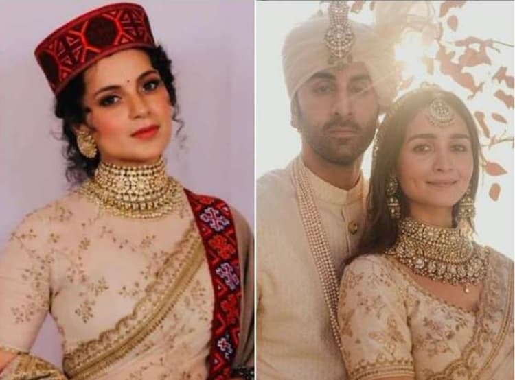 आलिया भट्ट ने अपनी शादी में सब्यासाची की डिजाइनर साड़ी पहनी थी. जिसमें वह काफी खूबसूरत लग रही थी. उन्होंने आइवरी कलर की कढ़ाईदार साड़ी पहनी थी, जिसके साथ एक दुपट्टा भी कैरी किया था. हालांकि अब उनके साड़ी को कंगना के एक लुक से कॉपी बताया जा रहा है.