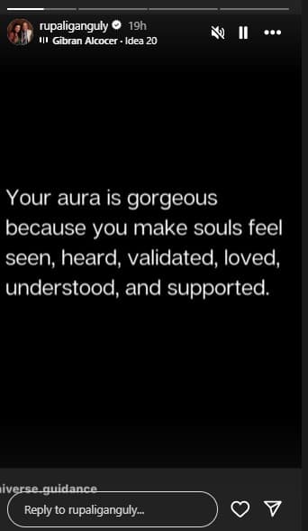 मदालसा के अनुपमा छोड़ने के कुछ समय बाद ही रूपाली गांगुली ने अपने इंस्टाग्राम पर एक स्टोरी लिखा. उन्होंने लिखा, आपका औरा इतना अमेजिंग है, क्योंकि आप सामने वाले को फील कराते हैं कि आपको देखा सुना समझा और वैल्यू दिया जा रहा. साथ ही सपोर्ट भी मिल रहा. फैंस इस पोस्ट को मदालसा से जोड़ कर देख रहे हैं.