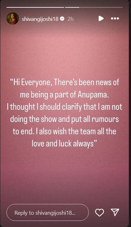 हालांकि, अब शिवांगी जोशी ने सीरियल अनुपमा का हिस्सा बनने पर रिएक्ट किया. उन्होंने इंस्टाग्राम स्टोरी पर एक पोस्ट शेयर किया, जिसमें लिखा, “सभी को नमस्कार, मेरे अनुपमा का हिस्सा बनने की खबर कई दिनों से सोशल मीडिया पर है. इसलिए मैंने सोचा कि मुझे क्लियर कर देना चाहिए कि मैं शो नहीं कर रही हूं और सभी रूमर्स पर फुलस्टॉप लगा रही हूं. मैं टीम को हमेशा प्यार और शुभकामनाएं भी देती हूं.”