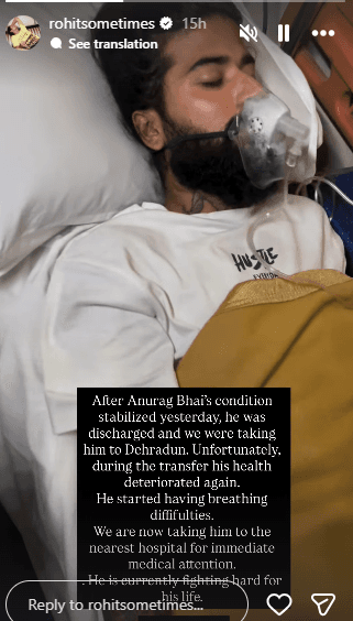 इंस्टाग्राम स्टोरी में रोहित ने बताया “कल जब अनुराग भाई की तबियत थोड़ी सुधरी थी, तो उन्हें अस्पताल से छुट्टी दे दी गई और हम उन्हें देहरादून ले जा रहे थे. लेकिन रास्ते में उनकी सेहत फिर खराब हो गई. उन्हें सांस लेने में कठिनाई होने लगी. अब हम उन्हें नजदीकी अस्पताल ले जा रहे हैं ताकि तुरंत इलाज किया जा सके. वह इस समय अपनी जान के लिए जद्दोजहद कर रहे हैं.”