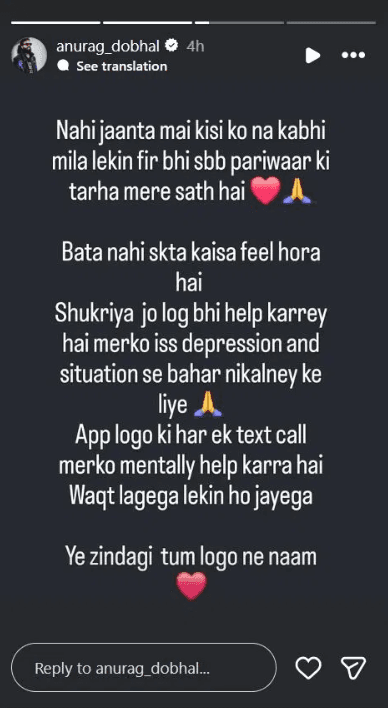 अनुराग ने अपने फॉलोअर्स के लिए लिखा, “मैं किसी को नहीं जानता, ना कभी मिला, लेकिन फिर भी सब परिवार की तरह मेरे साथ हैं. बता नहीं सकता कैसा महसूस हो रहा है. उन लोगों का शुक्रिया जिन्होंने मुझे इस स्थिति से बाहर निकाला. आप लोगों की हर कॉल और संदेश मुझे फायदा पहुंचा रही है. वक्त लगेगा लेकिन सब ठीक हो जाएगा. ये जिंदगी तुम लोगों के नाम.”