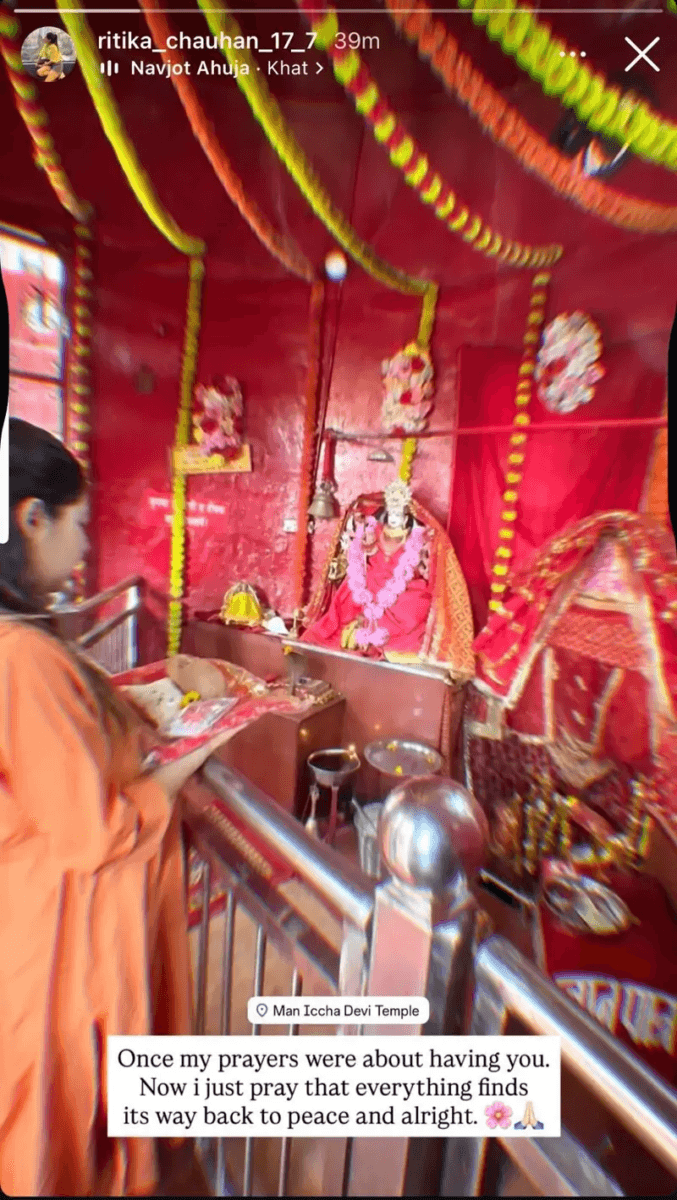 दरअसल, अनुराग की पत्नी रितिका चौहान ने अपने इंस्टाग्राम पर एक स्टोरी शेयर की, जिसमें वह मंदिर में खड़ी दिखाई दे रही हैं. तस्वीर के साथ उन्होंने लिखा, “पहले मेरी दुआएं तुम्हें पाने के लिए होती थीं, अब बस यही चाहती हूं कि सब कुछ फिर से ठीक और शांत हो जाए.” उनका यह मैसेज इस मुश्किल वक्त में अनुराग के लिए उम्मीद और सुकून की खबर है.