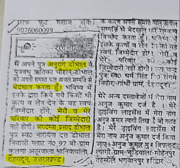 अनुराग डोभाल के पिता ने पब्लिकली अपने बेटे अनुराग डोभाल और बहू रितिका चौहान डोभाल से रिश्ता खत्म करने का ऐलान कर दिया है. दरअसल, सोशल मीडिया पर एक अखबार की कटिंग तेजी से वायरल हो रही है. इस नोटिस में अनुराग के पिता की तरफ से ऐलान किया गया है कि अनुराग डोभाल और उनकी पत्नी रितिका चौहान को उनकी सभी चल-अचल संपत्तियों से बेदखल किया जाता है. नोटिस में यह भी कहा गया है कि भविष्य में अगर दोनों किसी तरह का कोई काम या लेन-देन करते हैं तो उसके लिए वे खुद जिम्मेदार होंगे, परिवार की इसमें कोई जिम्मेदारी नहीं होगी.