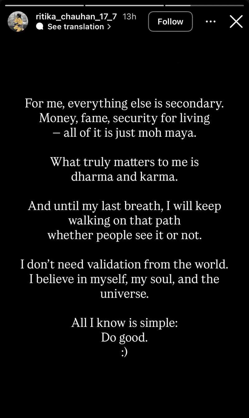 रितिका ने अपने पोस्ट में कहा कि उनके लिए पैसा, शोहरत या जिंदगी की सुरक्षा जैसी चीजें ज्यादा मायने नहीं रखतीं. उनके मुताबिक ये सब सिर्फ मोह-माया है. उन्होंने लिखा कि उनके लिए सबसे अहम धर्म और कर्म है और वे जिंदगी की आखिरी सांस तक इसी रास्ते पर चलती रहेंगी, चाहे कोई इसे देखे या नहीं. उन्होंने यह भी कहा कि उन्हें दुनिया से कोई जस्टिफिकेशन की जरूरत नहीं है. उन्हें खुद पर, अपनी आत्मा और इस ब्रह्मांड पर भरोसा है. उनके अनुसार जिंदगी का असली मंत्र सिर्फ इतना है कि अच्छा कर्म करो.