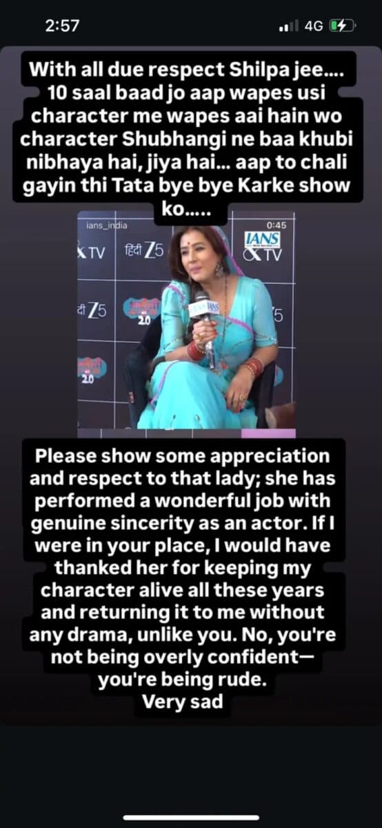 दरअसल, एक इंटरव्यू के दौरान शिल्पा शिंदे से पूछा गया कि उनके शो छोड़ने के बाद शुभांगी अत्रे द्वारा अंगूरी भाभी का किरदार निभाने को वह कैसे देखती हैं. इस पर शिल्पा ने कहा कि कॉमेडी हर किसी का जॉनर नहीं होता. उनका ये बयान कई लोगों को खटक गया, खासकर इसलिए क्योंकि शुभांगी अत्रे ने लगभग 10 साल तक इस किरदार को निभाया और दर्शकों के दिलों में अपनी अलग पहचान बनाई. इतना ही नहीं, एक दूसरे इंटरव्यू में जब शिल्पा से शुभांगी से तुलना को लेकर सवाल किया गया, तो उन्होंने साफ कहा कि उनकी तुलना किसी से नहीं की जा सकती और वह 10 साल बाद भी इंडस्ट्री में टिकी हुई हैं.