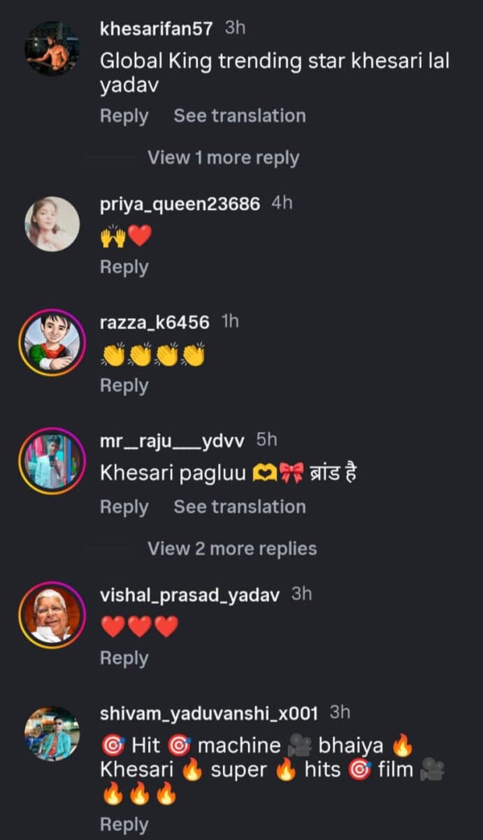 पोस्टर के रिलीज होते ही फैंस बीच उत्साह नजर आ रहा है. अब खेसारी लाल यादव के चाहने वाले फैंस इंस्टाग्राम कमेंट सेक्शन में भर-भर के अपना रिएक्शन दे रहे हैं.