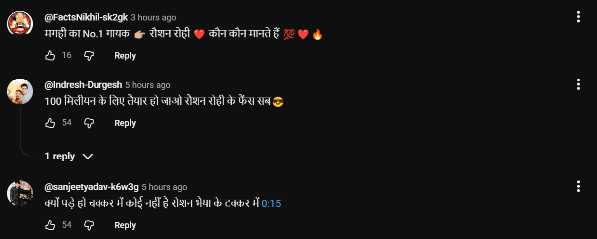 गाने पर तरह-तरह के कमेंट आ रहे हैं. एक यूजर ने कमेंट करते हुए लिखा कि “100 मिलियन के लिए तैयार हो जाओ, रोशन रोही के फैंस सब.” वहीं दूसरे ने कहा, “क्यों पड़े हो चक्कर में, कोई नहीं है रोशन भैया के टक्कर में.” इन कमेंट्स से साफ है कि फैंस के बीच रोशन रोही को लेकर जबरदस्त उत्साह और सपोर्ट देखने को मिल रहा है.