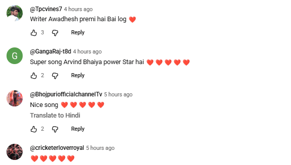 @GangaRaj-t8d नाम के यूजर ने लिखा, सुपर सॉन्ग अरविंद भैया पावर स्टार है. यूजर @BhojpuriofficialchannelTv ने लिखा, नाइस सॉन्ग. यूजर @DiyaSingh0002 ने लिखा, वॉव नाइस सॉन्ग. @drpnbmmovie नाम के यूजर ने लिखा, जियो शेर.