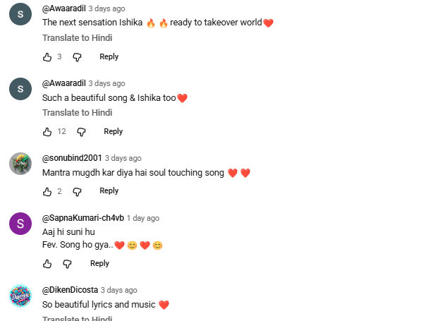 रिलीज के साथ ही यह गीत यूट्यूब और अन्य प्लेटफॉर्म्स पर तेजी से ट्रेंड कर रहा है. दर्शक इसे जमकर शेयर कर रहे हैं और कमेंट्स में इसकी तारीफ करते नहीं थक रहे. एक मीडिया यूजर ने कमेंट में लिखा, अगली सेंसेशन इशिका. दुनिया पर कब्जा करने के लिए तैयार. एक यूजर ने लिखा, बहुत खूबसूरत गाना है और इशिका भी खूबसूरत है. एक यूजर ने लिखा, आज ही सॉन्ग सुनी हूं और ये मेरा फेवरेट हो गया. एक यूजर ने लिखा, मंत्रमुग्ध कर दिया है.