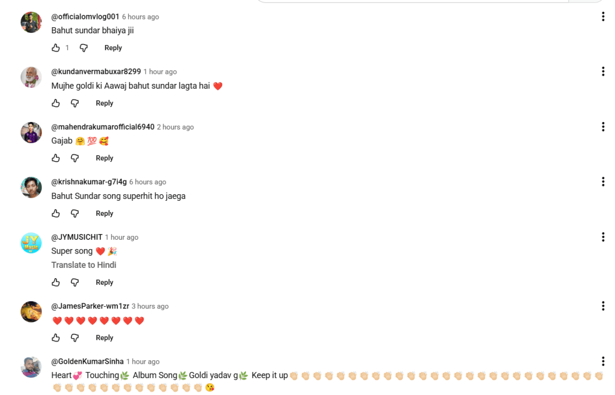 इस गाने के रिलीज होते ही सोशल मीडिया पर कमेंट्स की झड़ी लग गई है और लोग गोल्डी यादव की जमकर तारीफ कर रहे हैं. कमेंट सेक्शन में कुंदन वर्मा नाम के यूजर ने लिखा कि मुझे गोल्डी की आवाज बहुत प्यारी लगती है, वहीं कृष्ण कुमार ने लिखा कि यह गाना पक्का सुपरहिट होगा. गोल्डन कुमार सिन्हा ने दिल को छू लेने वाला गाना बताया है, तो महेंद्र कुमार और ऑफिशियल ओम ब्लॉग जैसे कई यूजर ने गजब और बहुत सुंदर लिखकर अपना प्यार लुटाया है.
