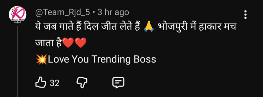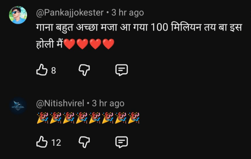 एक यूजर ने लिखा, यह होली के गाना खेसारी लाल यादव का गाना बहुत बढ़िया गाना है अखिलेश कश्यप. एक यूजर ने लिखा, खेसारी लाल यादव को कौन कौन ट्रेंडिंग स्टार मानता है. एक यूजर ने लिखा, मंदिर में पुजारी और भोजपुरी में खेसारी के रहना जरूरी बा. एक यूजर ने लिखा, पुराना खेसारी आ गया. एक यूजर ने लिखा, जब इंडस्ट्री में छान मारा तो खेसारी भैया सबसे आगे हैं ,लव यू खेसारी भैया. एक यूजर ने लिखा, गाना बहुत अच्छा मजा आ गया 100 मिलियन तय बा इस होली में.