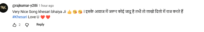 फैंस कमेंट्स में खेसारी लाल यादव की तारीफ करते नजर आ रहे हैं. यूजर @AnilKumar-my6tz ने कहा, सुपर बवाल गाना है. यूजर @HimanshuYadav-j1f1p ने लिखा, खेसारी लाल यादव आ चुके हैं. अब तबाही मचेगा. यूजर @rajkumar-y2l8i ने लिखा, बहुत अच्छा गाना खेसारी भैया जी. इसकी आवाज में जरूर कोई जादू है तभी तो लाखों दिलों में राज करते हैं. यूजर @myprincess9893 ने लिखा, जियो मेरे शेर.