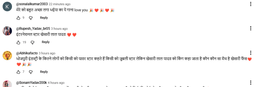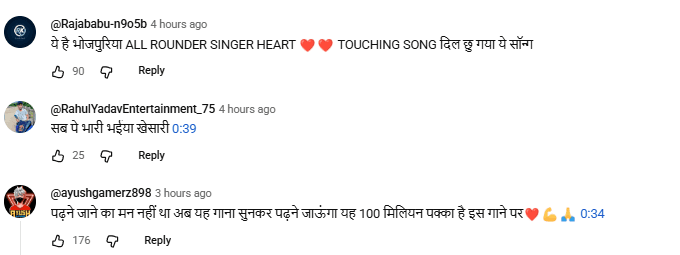 यूट्यूब पर यूजर्स सॉन्ग पर अपनी प्रतिक्रिया दे रहे हैं. एक यूजर ने लिखा, किसी ने मुझसे कहा की पवन सिंह सुर के बादशाह है तो किसी ने नीलकमल सिंह, लेकिन जब हमने इंडस्ट्री छान मारा तो खेसारी भैया सबसे आगे हैं, लव यू खेसारी भैया. एक ने लिखा, पढ़ने जाने का मन नहीं था अब यह गाना सुनकर पढ़ने जाऊंगा. 100 मिलियन पक्का है इस गाने पर. एक यूजर ने लिखा, टुनटुन भैया जब भी गाना लिखते हैं खेसारी भैया के आवाज में पूरा भोजपुरी में डंका बजता है. एक यूजर ने लिखा, जलवा पैदा करने वाला मशीन ओनली ट्रेंडिंग स्टार खेसारी लाल यादव.