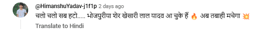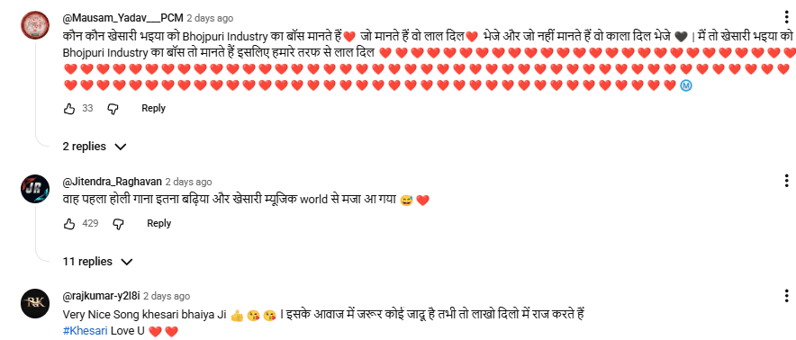 गाने को लेकर फैंस का जबरदस्त रिस्पॉन्स देखने को मिल रहा है. एक यूजर ने लिखा, “यही एक बंदा है जो असली ट्रेनिंग स्टार हैं”. वहीं दूसरे ने कमेंट किया, “चलो चलो सब हटो… भोजपुरीया शेर खेसारी लाल यादव आ चुके हैं, अब तबाही मचेगा”. एक और फैन ने लिखा, “वाह! पहला होली गाना ही इतना बढ़िया, खेसारी म्यूजिक वर्ल्ड से मजा आ गया”. इसके अलावा, कई यूजर्स ने रेड हार्ट इमोजी के साथ अपना प्यार जताया है.