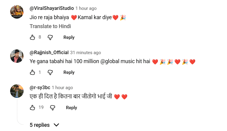 गाने “ठुमका ठुमका” पर फैंस का जबरदस्त प्यार देखने को मिल रहा है, जिसका अंदाजा सोशल मीडिया पर आए कमेंट्स से साफ लगाया जा सकता है. एक यूजर @ViralShayariStudio ने लिखा, “Jio re raja bhaiya Kamal kar diye”, तो वहीं @vishalpandeybaba ने Khesari Lal Yadav को “Bawal Ba Hit Machine ” बताते हुए गाने की जमकर तारीफ की. इसके अलावा @rskvlogs7195 ने इसे “Jabardast song ” कहा, जबकि @chanduyadav9147 का कहना है कि यह “Lajawab song” है. इन प्रतिक्रियाओं से साफ है कि यह गाना रिलीज होते ही लोगों के दिलों पर छा गया है और तेजी से वायरल हो रहा है.