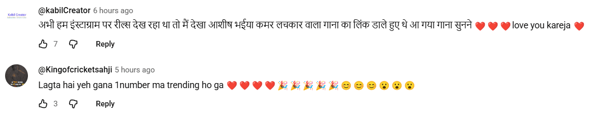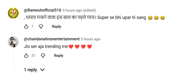गाना रिलीज होते ही दर्शकों का ध्यान खींच रहा है. इसकी धुन और बीट्स लोगों को पसंद आ रही हैं, जिससे यह गाना सोशल मीडिया पर भी धीरे-धीरे वायरल हो रहा है. एक यूजर @chandanahiranentertainment ने लिखा, जियो शेर ट्रेंडिंग में. दूसरे यूजर @Nitishyadav-y5v ने लिखा, बहुत जल्द 100 मिलियन जाएगा भाई. तीसरे यूजर @ChintuRaja-p6 ने लिखा, जियो आशीष भाई सुपर-डूपर सॉन्ग.