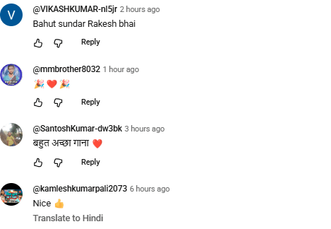 गाने पर कमेंट करते हुए एक यूजर @VIKASHKUMAR ने लिखा, बहुत सुंदर, राकेश भाई. @SantoshKumar-dw3bk नाम के यूजर ने लिखा, बहुत अच्छा गाना. @Kundankamal84 के यूजर ने लिखा, सुपर हिट गाना. यूजर @akashNissan-c8f7i ने लिखा, सुपर सॉन्ग. यूजर @amodroyofficial6940 ने लिखा, बेस्ट सॉन्ग.