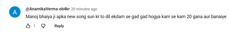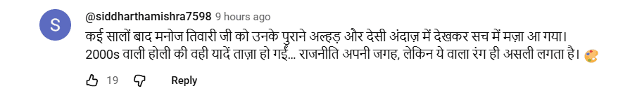 कई फैंस ने इस गाने ‘होलरिया’ पर अपनी प्रतिक्रिया साझा की. एक यूजर ने लिखा, “कई सालों बाद मनोज तिवारी जी को उनके पुराने अल्हड़ और देसी अंदाज़ में देखकर सच में मजा आ गया. 2000s वाली होली की वही यादें ताजा हो गईं… राजनीति अपनी जगह, लेकिन ये वाला रंग ही असली लगता है. 🎨” दूसरे यूजर ने कहा, “Manoj bhaiya ji apka new song sun kr to dil ekdam se gad gad hogya, kam se kam 20 gana aur banaiye!” वहीं एक और फैन ने अपनी भावनाएं साझा करते हुए लिखा “वाह! आखिरकार फिर से वही पुराने वाले मनोज तिवारी दिखे. बचपन की होली और कैसेट वाले दिन याद आ गए ❤️”