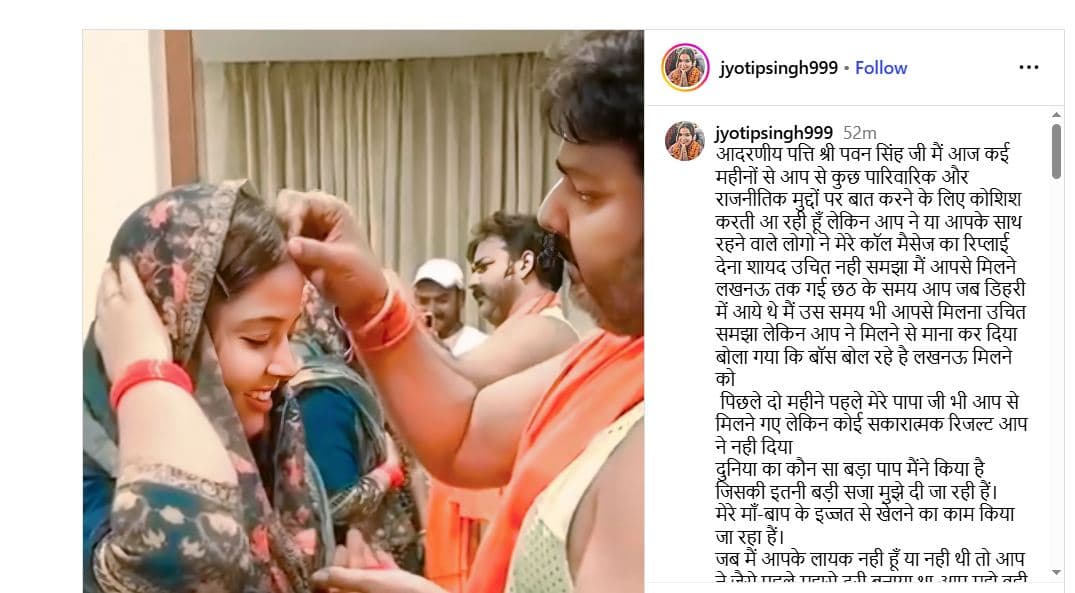दरअसल भोजपुरी सुपरस्टार की पत्नी ज्योति सिंह ने इंस्टाग्राम पर एक पोस्ट शेयर किया. जिसमें पवन सिंह प्यार से उन्हें सिंदूर लगाते दिखाई दे रहे हैं. तसवीर में दोनों के बीच का प्यार झलक रहा है. हालांकि हकीकत सेलिब्रिटी वाइफ ने कैप्शन में बयां किया. उन्होंने लिखा, आदरणीय पत्ति पवन सिंह जी मैं कई महीनों से आप से कुछ पारिवारिक और राजनीतिक मुद्दों पर बात करने की कोशिश कर रही है, लेकिन आप न तो मेरे कॉल ना ही मैसेज का कोई रिप्लाई देना जरूरी समझ रहे हैं. मैं आपसे मिलने के लिए लखनऊ तक गई, लेकिन आपने मिलने से मना कर दिया.