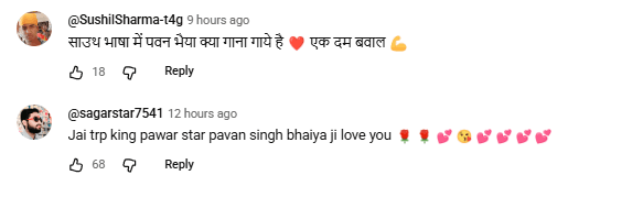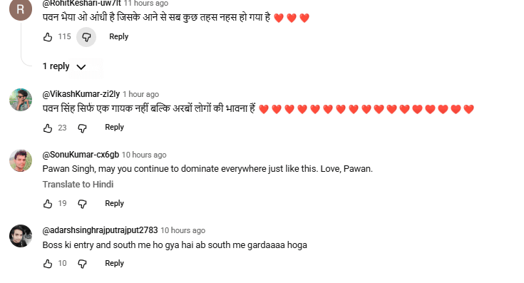 गाना रिलीज होते ही सोशल मीडिया पर फैंस की प्रतिक्रियाएं तेजी से सामने आने लगी. यूजर @RakeshKumar-t7c2n ने कमेंट कर लिखा, जियो शेर पवन भैया आप इसी तरह धमाल मचा रहे हैं. यूजर @shivamsfeeling444 ने लिखा, बॉस की एंट्री और पवन सिंह की आवाज में साउथ के लिरिक्स. यूजर @Kitturamjaane1429 ने लिखा, सबका रिकॉर्ड तोड़ेगा टीआरपी भोजपुरी किंग पावर स्टार पवन सिंह जी. यूजर @PintuSingh-lp6yp ने लिखा, फिल्म हिट होगी पवार स्टार पवन सिंह की आवाज जो है सुपर. यूजर @adarshsinghrajputrajput2783 ने लिखा, बॉस की एंट्री और साउथ में हो गया है अब साउथ में गर्दा मचेगा. यूजर @SushilSharma-t4g ने लिखा, साउथ भाषा में पवन भैया क्या गाना गाये है. एकदम बवाल. यूजर @atalkumarsingh8514 ने लिखा, गरदा हो गया पवन भैया.