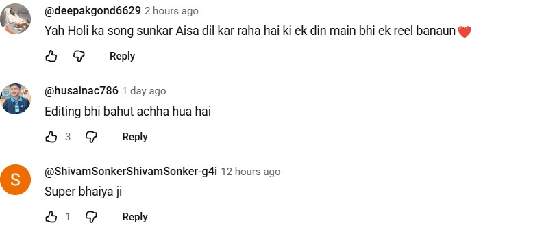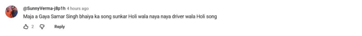 सॉन्ग पर सोशल मीडिया यूजर्स अपना रिस्पॉन्स दे रहे है. एक यूजर ने कमेंट में लिखा, मजा आ गया समर सिंह भैया का सॉन्ग सुनकर. बिल्कुल होली वाला नया ड्राइवर सॉन्ग. एक यूजर ने लिखा, सुपर भैया जी. एक यूजर ने लिखा, यह होली सॉन्ग सुनकर मन कर रहा है कि एक दिन मैं भी एक रिल्स बनाऊं. एक यूजर ने लिखा, 500 मिलियन जाएगा. एक यूजर ने लिखा जियो शेर. एक यूजर ने लिखा, फिर से उसी देसी अंदाज में जियो देसी स्टार.