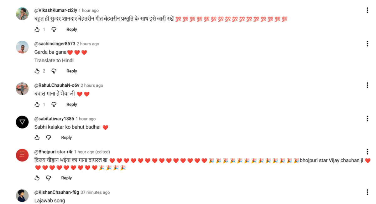 गाना के रिलीज होते ही फैंस के कमेंट्स के बरसात हो गए. एक यूजर @sachinsinger8573 ने लिखा, गर्दा बा गाना. दूसरे यूजर @sabitatiwary1885 ने लिखा, सभी कलाकार को बहुत बधाई. तीसरे यूजर @Bhojpuri-star-r4r ने लिखा, विजय चौहान का गाना वायरल बा.