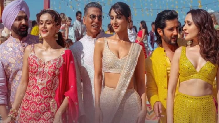 बॉलीवुड एक्टर अक्षय कुमार ने अपनी फिल्म ‘सरफिरा’ के बाद अगली फिल्म ‘खेल खेल में’ की तैयारी शुरू कर दी हैं. इस फिल्म का नया गाना ‘हौली हौली’ रिलीज हो चुका है, जिसमें उनके साथ वाणी कपूर, एमी विर्क, तापसी पन्नू, आदित्य सील और प्रज्ञा जायसवाल नजर आएंगे. इस गाने में उन्हें एक पार्टी सॉन्ग में देखा जा सकता है, जो शायद किसी समारोह के दौरान फिल्माया गया है। इस अवसर पर सभी सेलेब्स एथनिक ड्रेस में नजर आए हैं.