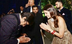 विराट कोहली और अनुष्का शर्मा ने मुंबई में ग्रैंड रिसेप्शन पार्टी दी. इस पार्टी में बॉलीवुड से लेकर क्रिकेट जगत की तमाम बड़ी हस्तियों शामिल हुई. रिसेप्शन की फोटो और वीडियोज सोशल मीडिया पर छाई हुई है. विराट-अनुष्का के अलावा इस पार्टी में शामिल होनेवाले सितारों पर भी नजरें टिकी रहीं. इसी पार्टी की एक तसवीर सोशल मीडिया पर खूब वायरल हो रही है जिसमें महानायक अमिताभ बच्चन, अनुष्का के सामने हाथ जोड़कर झुककर उन्हें बधाई दे रहे हैं. वहीं अनुष्का भी झुककर उनकी बधाई स्वीकार कर रही है. इस तसवीर को बेहद पसंद किया जा रहा है. इस तसवीर में अनुष्का खिलखिलाकर मुस्कुरा रही हैं.