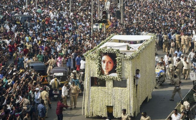 अभिनेत्री ने ‘मंडरम पिरई’, ‘मिस्टर इंडिया’और ‘इंग्लिश विंग्लिश’ जैसी विविध फिल्मों से अपने अभिनय से लोगों को मंत्रमुग्ध किया। बोनी कपूर, सौतेले बेटे अर्जुन कपूर और परिवार के अन्य सदस्य पार्थिव शरीर के साथ थे. लोगों की उतावली भीड़ देख अर्जुन कपूर ने उनसे हाथ जोड़कर विनय किया कि अंतिम यात्रा आराम से गुजरने दें. हेमामालिनी ने ट्वीट किया कि श्रीदेवी को अंतिम श्रद्धांजलि दी. पूरा फिल्मोद्योग दुख में डूबा हुआ है. फिल्मों में उनकी आभा और जादू था. श्रीदेवी का पार्थिव शरीर अंतिम संस्कार के लिए ले जाये जाने से पहले सेलिब्रेशन्स स्पोर्ट्स क्लब में एक प्रार्थना सभा हुई.