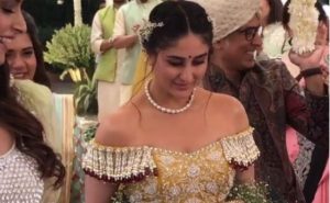 हाथ में कलीरें पहने खूबसूरत करीना ने इस सीन के लिए पीले रंग का लहंगा और ऑफ शोल्डर ब्लाउज पहना था. इस ड्रेस को अबू जानी और संदीप खोसला ने डिजायन किया है.