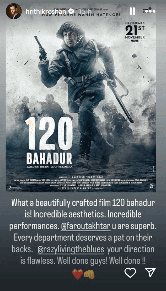 ऋतिक रोशन ने अपनी इंस्टाग्राम स्टोरी पर ‘120 बहादुर’ फिल्म का पोस्टर शेयर करते हुए लिखा, “120 बहादुर कितनी खूबसूरती से बनाई गई फिल्म है! कमाल का लुक, कमाल की परफॉर्मेंस. @faroutakhtar आप शानदार हैं. हर डिपार्टमेंट की पीठ थपथपाई जानी चाहिए. @razylivingtheblues आपका डायरेक्शन बेहतरीन है. बहुत बढ़िया दोस्तों, बहुत बढ़िया!!”