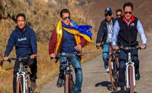 सलमान खान का साईकिल चलाने का शौक किसी से छुपा नहीं है. सलमान इनदिनों अपनी फिल्म भारत की शूटिंग को लेकर खासा व्यस्त हैं. लेकिन इस बीच वे शूटिंग से समय निकालकर सलमान गुरुवार का अरुणाचल प्रदेश के मेचुका में आयोजित एक एडवेंचर फेस्टिवल में भाग लेने पहुंचे. अरुणाचल प्रदेश के मुख्यमंत्री पेमा खांडू और केन्द्रीय मंत्री किरन रिजिजू की मौजूदगी में माउंटेन बाइसाइकल रेस का उद्घाटन किया. वे मुख्यमंत्री पेमा खांडू और मंत्री किरन रिजिजू के साथ साईकिल चलाते भी दिखे.