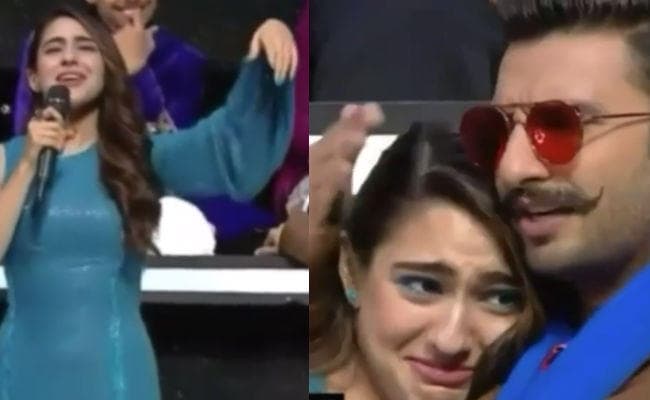 सारा अली खान और रणवीर सिंह इनदिनों अपनी आनेवाली फिल्म सिंबा के प्रमोशन में बिजी हैं. पिछले कुछ दिनों से दोनों लगातार किसी ने किसी रियेलिटी शो में नजर आ रहे हैं. हाल ही में सारा और रणवीर सिगिंग रियेलिटी शो ‘सा रे गा मा पा’ के सेट पर पहुंचे. जहां दोनों ने जमकर मस्ती की. इस शो का एक वीडियो सामने आया है जिसमें सारा अली खान गाना गाती नजर आ रही हैं. लेकिन जैसे ही सारा अपना गाना खत्म करती हैं स्टेज पर रोने की आवाज आती है. वहीं रणवीर सारा का मजाक उड़ाते नजर आते हैं.