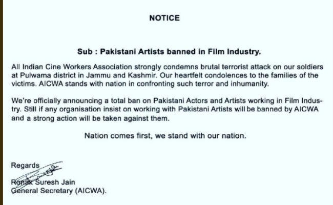 जम्‍मू कश्‍मीर के पुलवामा जिले में हुए आतंकी हमले में सीआरपीएफ के 40 जवान शहीद हो गये. इससे पूरे देश में पाकिस्तान के खिलाफ लोगों का गुस्‍सा फूट पड़ा है. बॉलीवुड इंडस्ट्री ने भी इस हमले की कड़ी निंदा की है. अब ऑल इंडिया सिने वर्कर्स एसोसिएशन (AICWA) ने फिल्‍म इंडस्‍ट्री में काम कर रहे पाकिस्‍तानी कलाकारों और आर्टिस्‍ट्स को पूरी तरह से बैन करने की घोषणा की है. इस बाबत AICWA के जनरल सेक्रेटरी रौनक सुरेश जैन की ओर से एक नोटिस जारी किया गया है.