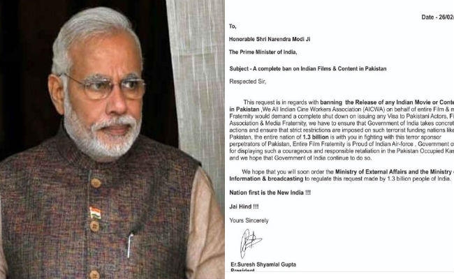 AICWA ने एक लेटर के जरिये अपनी बात पीएम मोदी तक पहुंचाई है. न्‍यूज एंजेंसी ANI ने ट्वीट कर इस लेटर को साझा किया है. इस लेटर में लिखा गया है कि,’ पीएम नरेंद्र मोदी से अपील है कि वह किसी भी पाकिस्‍तान आर्टिस्‍ट को वीजा न दें. इसके अलावा किसी भी भारतीय फिल्‍म और कंटेट को पाकिस्‍तान में ने रिलीज किया जाये.’