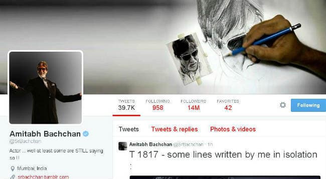 अमिताभ ने इसे लेकर ट्विटर पर लिखा, ट्विटर पर 1.4 करोड़ प्रशंसक. फेसबुक पर 2 करोड़…ब्लॉग पर 30 लाख…लगभग 4 करोड़. बडूम्बा. सोशल मीडिया पर बेहद सक्रिय रहने वाले अभिनेता अकसर अपनी निजी एवं पेशेवर जिंदगी के क्षण अपने प्रशंसकों से साझा करते रहते हैं. वह अब तक 39,700 ट्वीट कर चुके हैं.