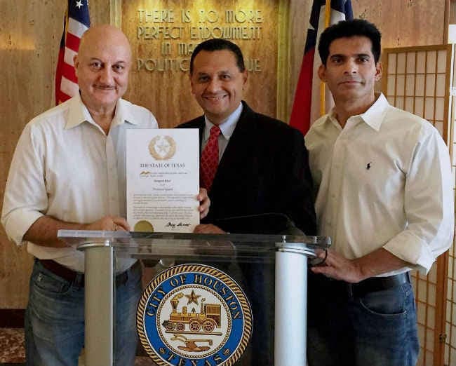 ह्यूस्टन की मेयर अनिसे पार्कर ने समुदाय को अच्छा मनोरंजन मुहैया कराने के प्रति अभिनेता की प्रतिबद्धता को सराहा और ह्यूस्टन में सात अगस्त को अनुपम खेर दिवस घोषित किया. अनुपम खेर और नीना गुप्ता ने यहां सात अगस्त को प्रस्तुत किए गए नाटक में शानदार अभिनय किया था. खेर को लैंगिग समानता की मुहिम ‘हीफॉरशी’ के लिए संयुक्त राष्ट्र का राजदूत नियुक्त किया गया है.