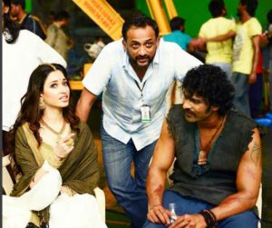फिल्म में अवंतिका का किरदार निभानेवाली तमन्ना भटिया और शिवागामी का किरदार निभानेवाली राम्या कृष्णन सेट पर एकदूसरे से बात करते हुए.