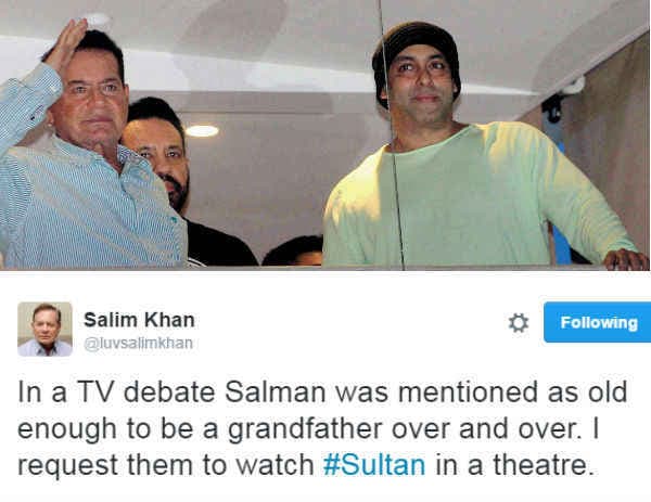 इस कमेंट से नाराज सलीम खान ने ट्विटर पर एक के बाद एक कई ट्विटस किये और फिल्म ‘सुल्तान’ देखने की नसीहत भी दे डाली. उनहोंने लिखा,’ एक टीवी डिबेट में बार-बार सलमान खान को दादाजी के उम्र का बताया जा रहा था. मेरी उनसे गुजारिश है कि वो जाकर सुल्तान देखें.’