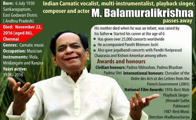 उनके परिवार के सूत्रों ने कहा कि 86 साल के गायक कुछ समय से बीमार थे और आज यहां अपने घर पर उन्होंने अंतिम सांसें लीं. एम बालामुरलीकृष्णा आंध्र प्रदेश के पूर्वी गोदावरी जिले के शंकरगुप्तम के रहने वाले थे. उन्होंने संगीत एवं सिनेमा की दुनिया में अपनी जगह बनाने के लिए चेन्नई को अपना घर बना लिया.